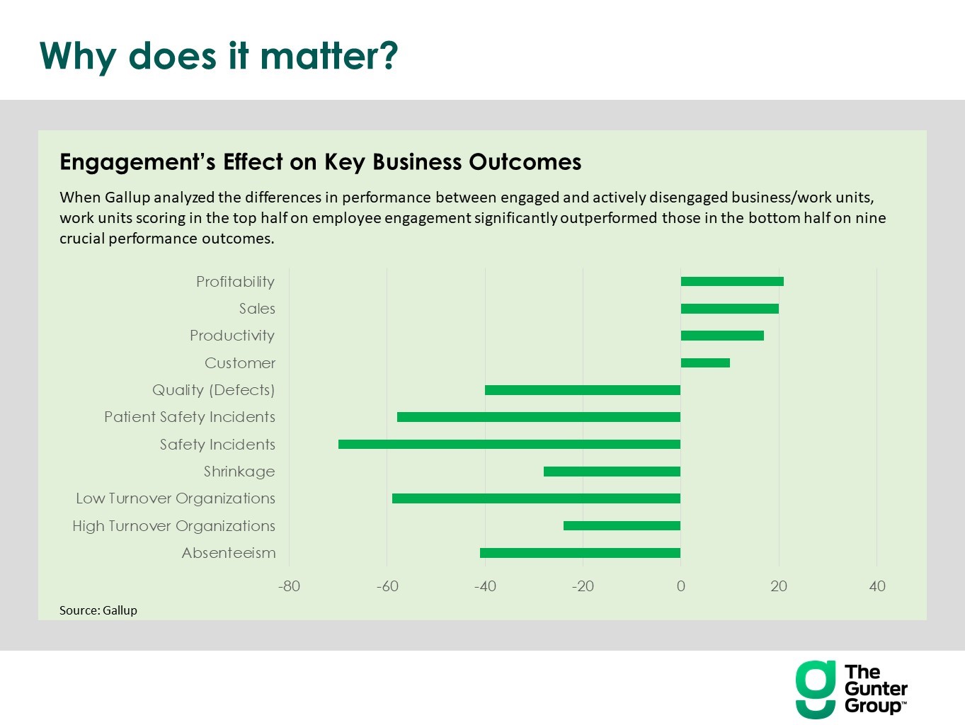 Business outcomes are directly impacted by employee engagement and are a key driver for implementing an employee engagement program. In an analysis completed by Gallup, a popular vendor for employee engagement surveys, results revealed that groups with higher employee engagement ratings significantly outperformed groups with lower ratings on crucial performance outcomes, including decreased turnover rates (2).