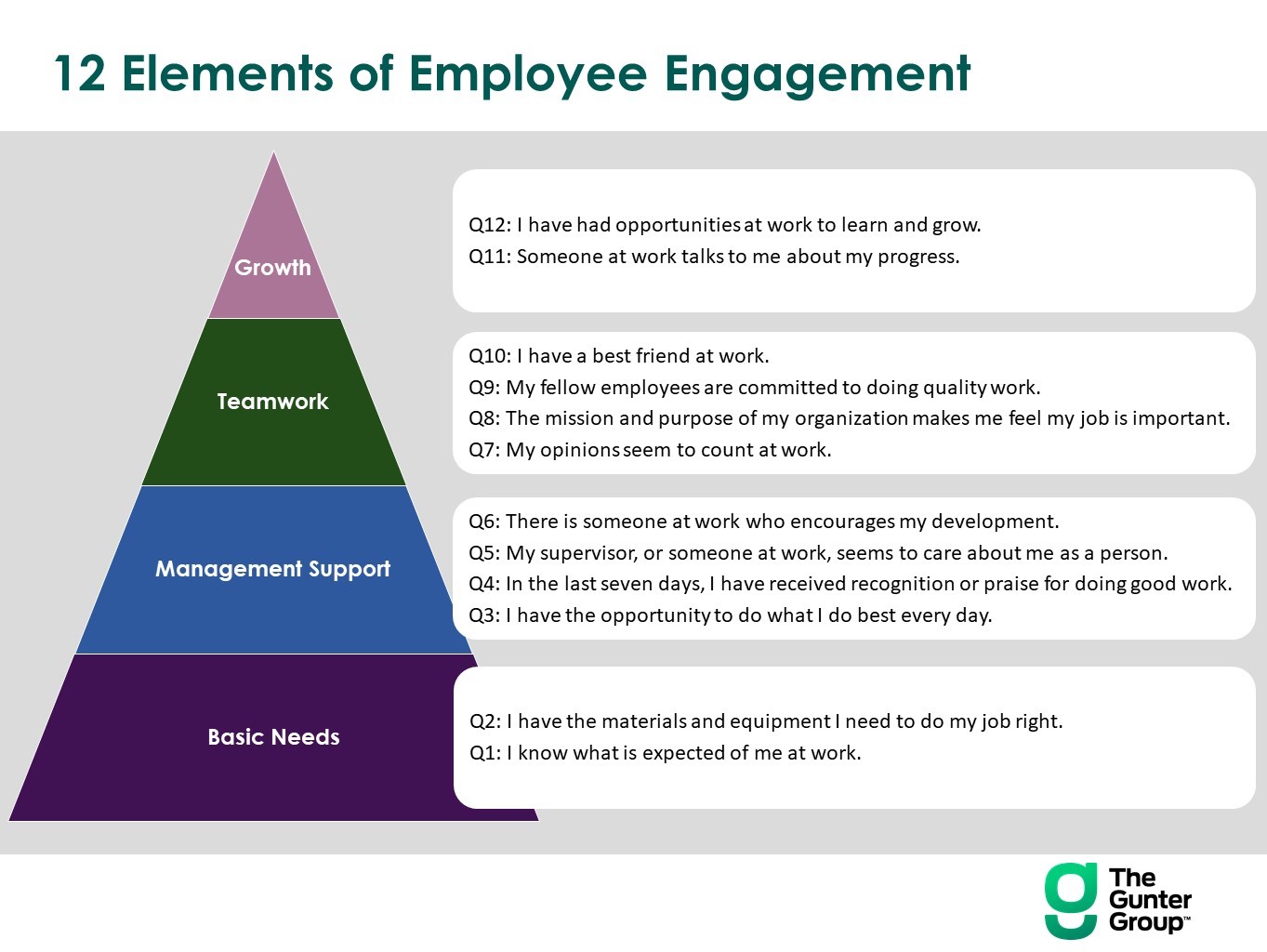 The 12 elements can be categorized based on four key areas: Basic Needs, Management Support, Teamwork, and Growth. These must be viewed as foundational. Basic Needs must be met before shifting to Management Support. Management Support must be solid before focusing on Teamwork, and so on. When using an engagement survey provided by Gallup, the results include these 12 elements and are helpful in honing focus areas to ensure your employees’ needs are being met.